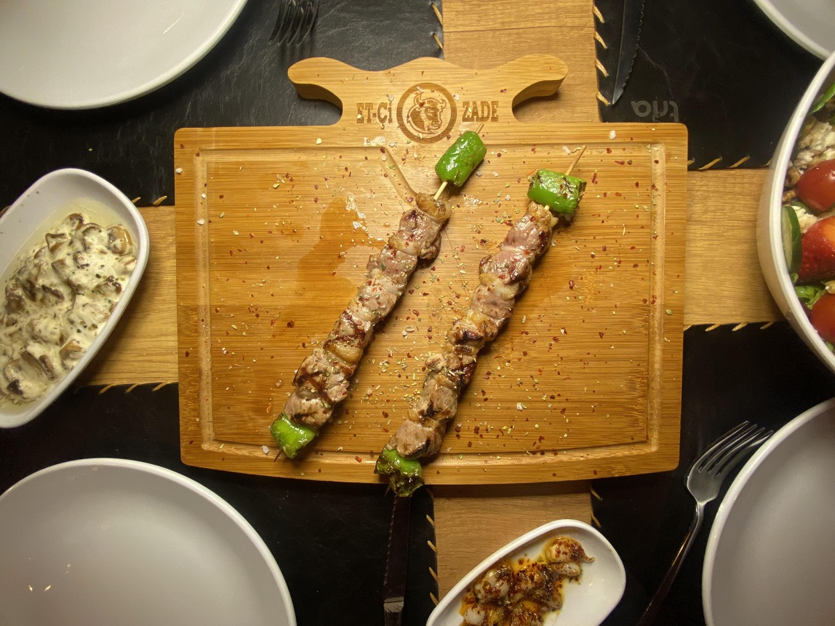 300gr Kuşbaşı, çöp şiş, Izgara patates, Kremalı mantar, Köz sarımsak, Karamelize soğan